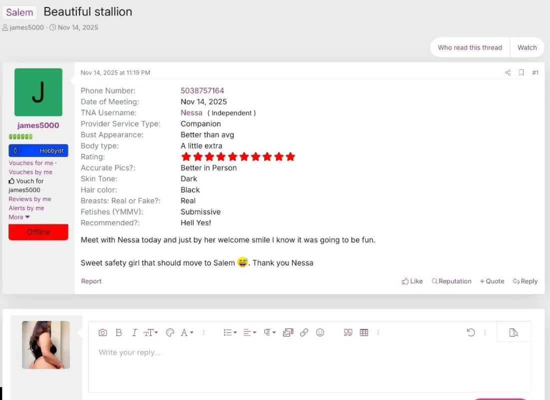 MAKE SURE TO READ AD BEFORE CONTACTING ME! Hey yall im Nessa ๐ yes I am real! And yes I do ft verify! I am super nice and open minded ๐I like to make sure you're as comfortable as possible with me โค incall and outcalls ! Outcalls to Surrounding areas are okay for traveling. let's get you booked! UPDATED and recent pics ! Your fav. Thick and curvy pretty in the face mix girl ๐ I take hygiene seriously always smelling good and freshly showered ! ๐๐ฆ (i expect you to be showered as well!!) *No bb no bbbj* do not send me dick pictures Unless I ask! You will be blocked immediately! no provocative txting If we haven't met before a $20 deposit is required for new clients. Or if you have references from other girls. qv140 hh200 hr300 2hours550 overnight 1500 (7 hours, dinner must be included) over 50 reviews on tnaboard username is Nessa or this is the link to my profile https://tnaboard.me/Nessa